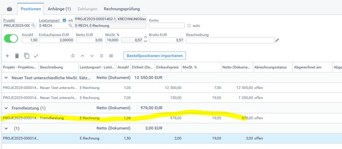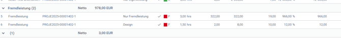 Fremdleistungen sind gruppierbar. Sobald eine Gruppe mit Fremdleistungen in der Rechnung enthalten ist, wird diese als Pauschale zusammengefasst und in der XML-Datei ausgewiesen. Voraussetzung hierfür ist, dass in der Dokumentvorlage auch eine Gruppenpositionsvorlage vorhanden ist.