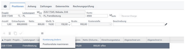 Die Funktion "Kontierung ändern" finden Sie im Funktionsmenü der Positionsliste.