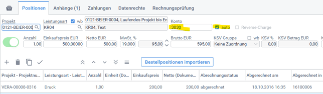 In den Positionslisten stehen zudem die Felder "Konto" und "auto" pro Position zur Verfügung.