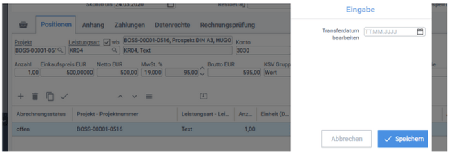 Hier kann das Transferdatum geleert werden, dadurch wechselt der Status der Eingangsrechnung von "An die FiBu übertragen" zu "Gebucht" und kann anschließend bearbeitet werden.