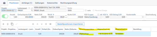 Wichtig: Hat eine Eingangsrechnungsposition den Status "gewählt" oder "Abgerechnet in" (Eingangsrechnung wurde in die Ausgangsrechnung importiert und weiterberechnet) ist keine Änderung mehr möglich.